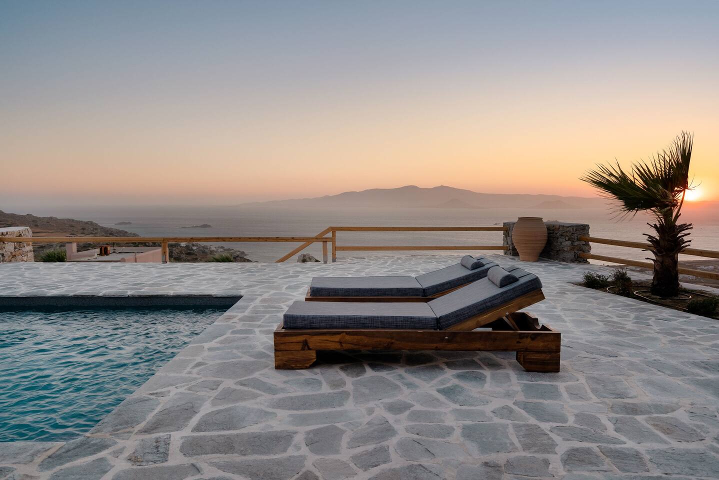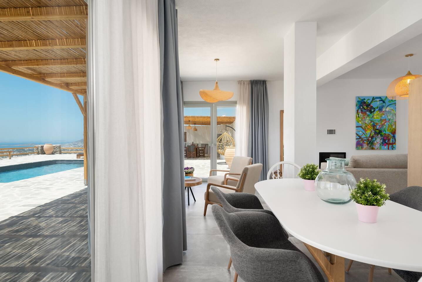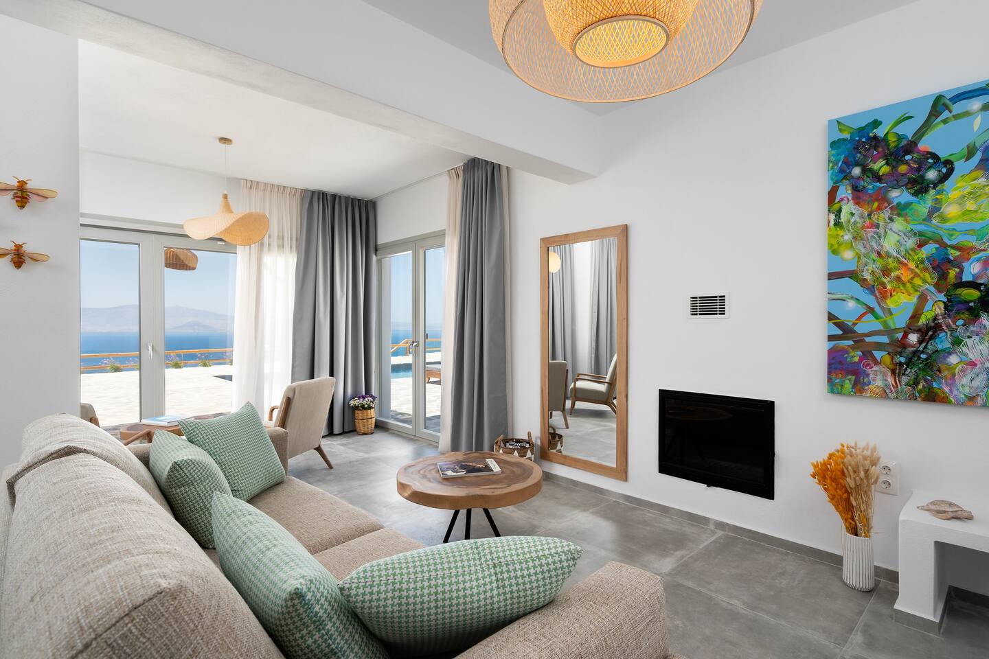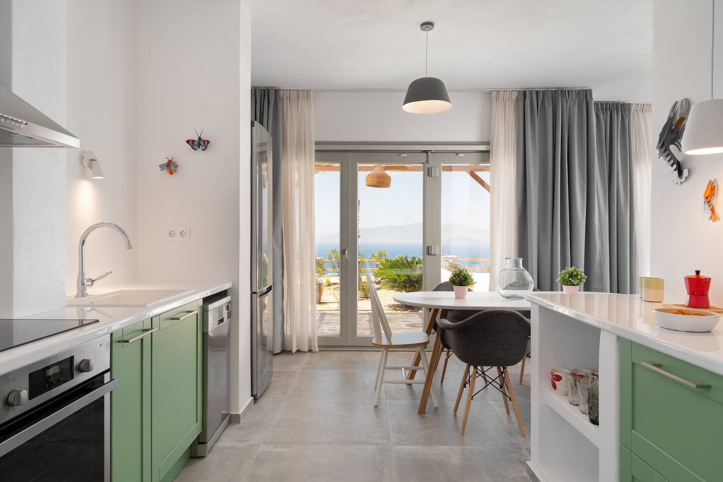 This two-story villa offers the perfect blend of comfort and elegance: Two spacious bedrooms on the first floor, each with an ensuite bathroom. A sofa bed in the living room that can become 1 double bed. A bright living room on the ground floor with a fully equipped kitchen and a guest WC. A dedicated laundry room with a washing machine and dryer. A private swimming pool with a refreshing outdoor shower. Relax and soak in the breathtaking sea and sunset views!! Ideal for families, couples, or groups seeking tranquility and luxury.