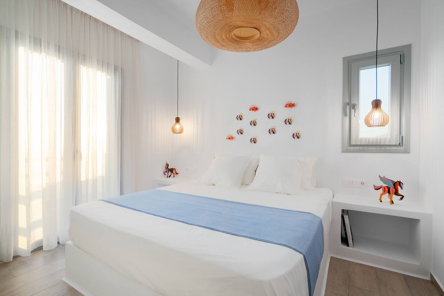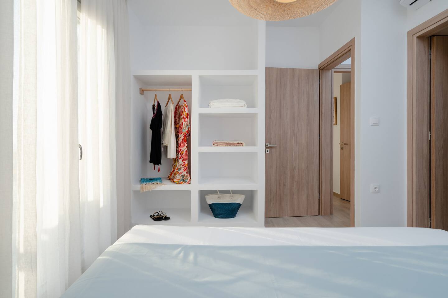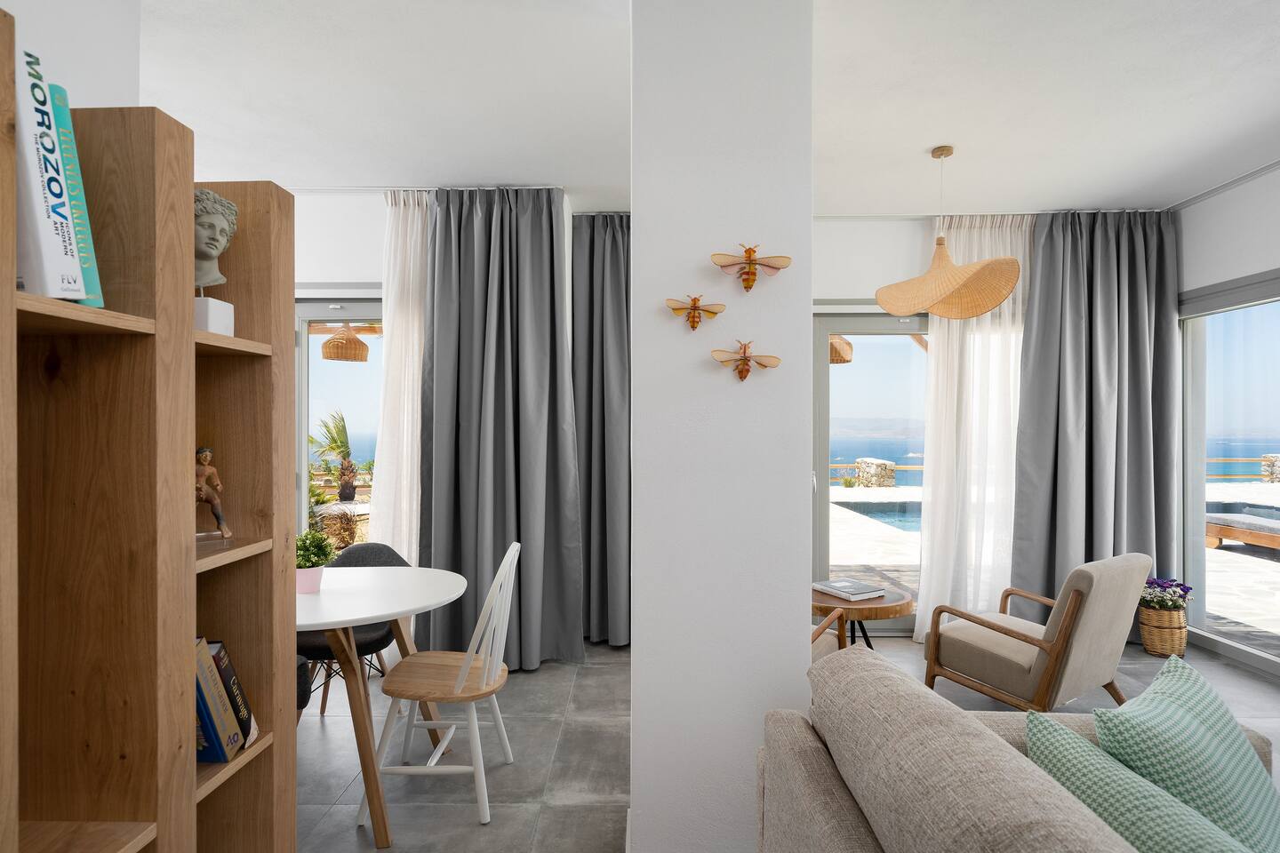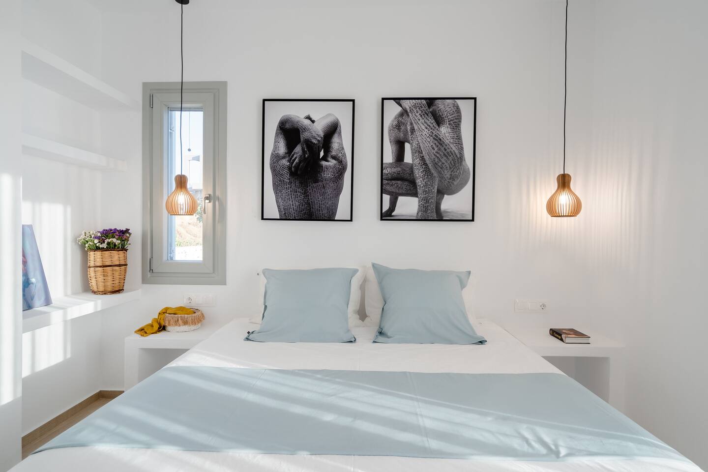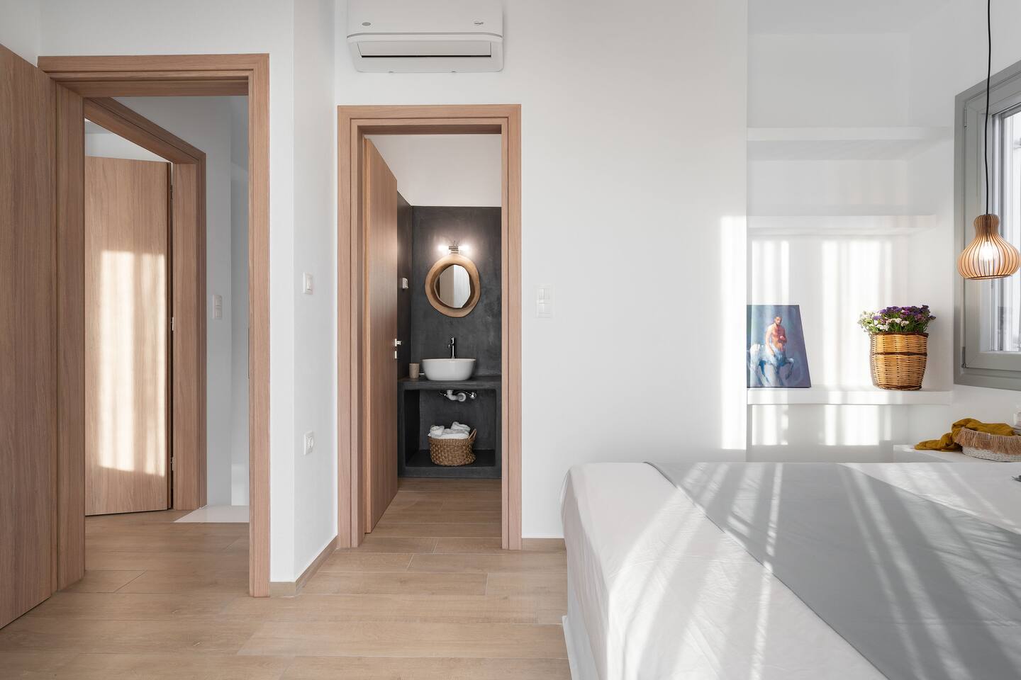 This two-story villa offers the perfect blend of comfort and elegance: Two spacious bedrooms on the first floor, each with an ensuite bathroom. A sofa bed in the living room that can become 1 double bed. A bright living room on the ground floor with a fully equipped kitchen and a guest WC. A dedicated laundry room with a washing machine and dryer. A private swimming pool with a refreshing outdoor shower. Relax and soak in the breathtaking sea and sunset views!! Ideal for families, couples, or groups seeking tranquility and luxury.